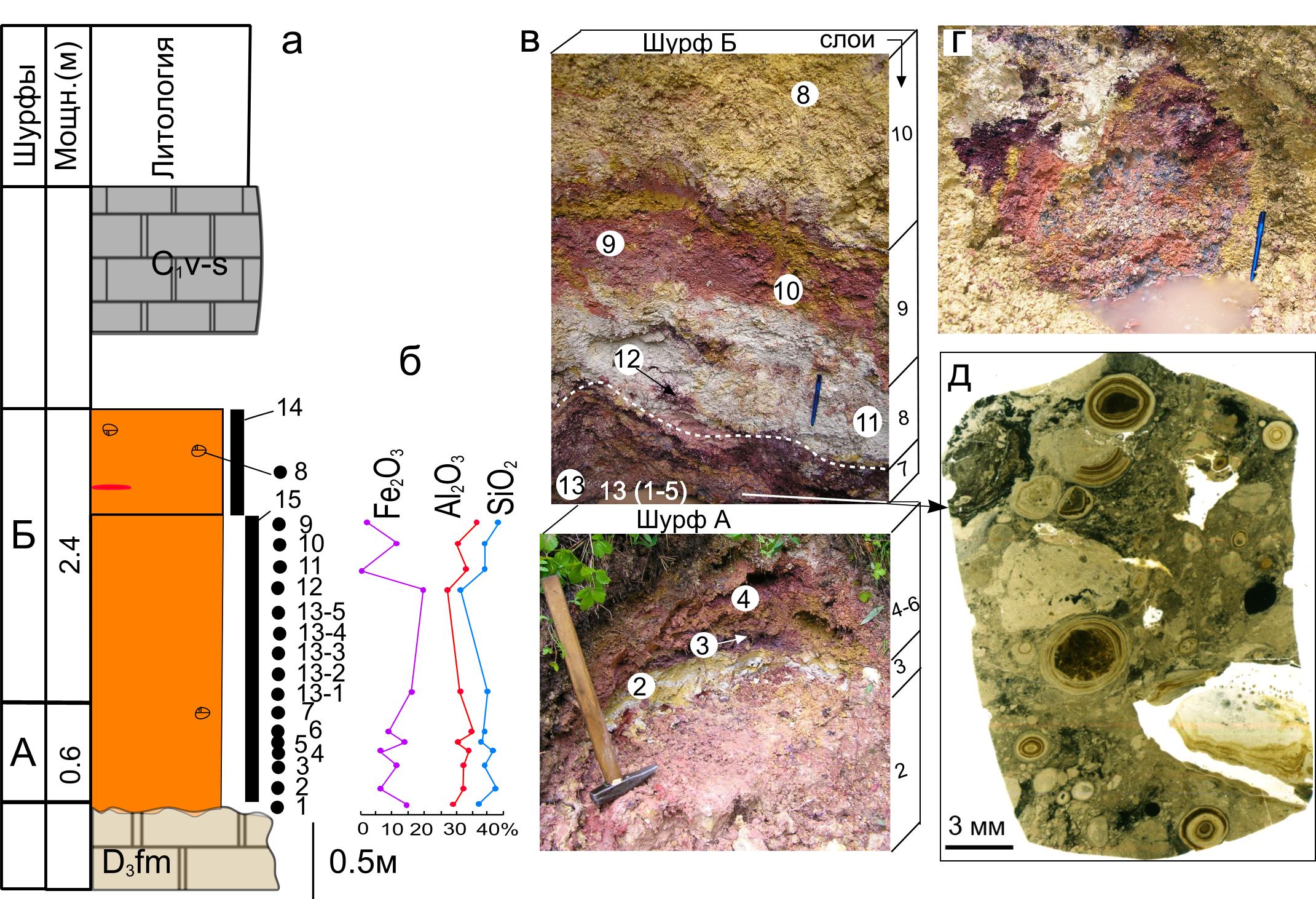 Рисунок 5. Нижнекаменноугольные каолины в профиле № 1 на правом берегу р. Черь Ижемской: а – литологическая колонка с показом отбора образцов (черные точки) и бороздовых проб (черные прямоугольники), б – распределение основных породообразующих оксидов по разрезу; в – фотографии стенок шурфов с обозначенными слоями (справа от фото) и местами отбора проб (номера образцов показаны цифрми в белых кругах); г – овально-круглое тело пестроцветных каолинов в верхней части разреза на северо-западной стенке шурфа Б; д – оолитово-обломочно-пелитоморфная структура в обр. 13-3 каолинитовой глины из слоя 7 (сканированный шлиф).