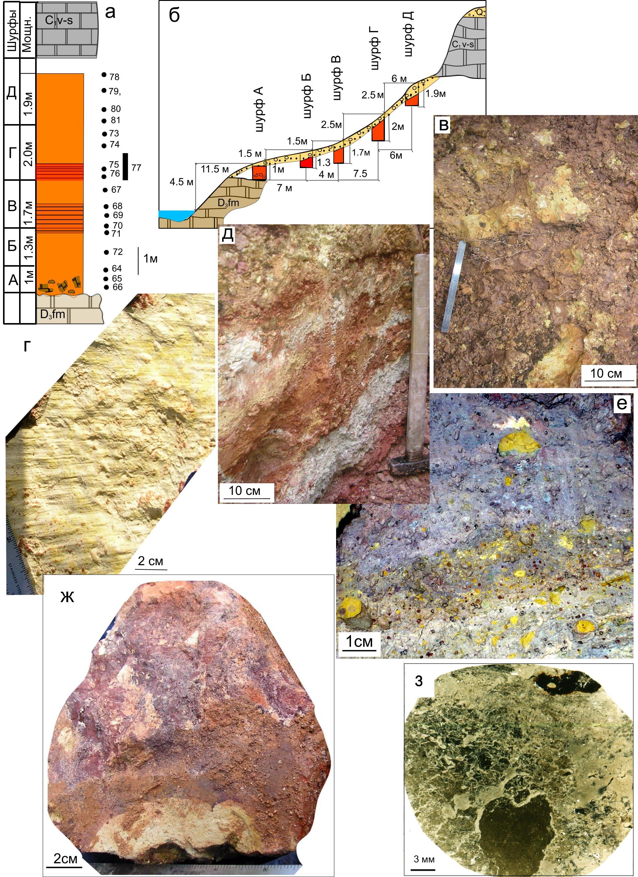 Рисунок 7. Нижневизейские каолины в профиле № 14 на правом берегу р. Черь Ижемской: а – литологическая колонка; б – схема расположения шурфов; в – доломитовые обломки в кирпично-красной глине на границе с верхним девоном в нижней части шурфа А (длина линейки – 22 см); г – зеркала скольжения на белой поверхности разноцветных аргиллитов в шурфе В, д – слоисто-окрашенные кирпично-красные и белые каолиниты в северо-западной стенке шурфа Г (длина ручки молотка – 50 см); е – пизолитовая структура в основании слоя фиолетовых аргиллитов в шурфе Б; ж – разноцветные аргиллиты с псефитовой структурой в шурфе В; з – обломочная структура в аргиллитах в шурфе В (сканированный шлиф).