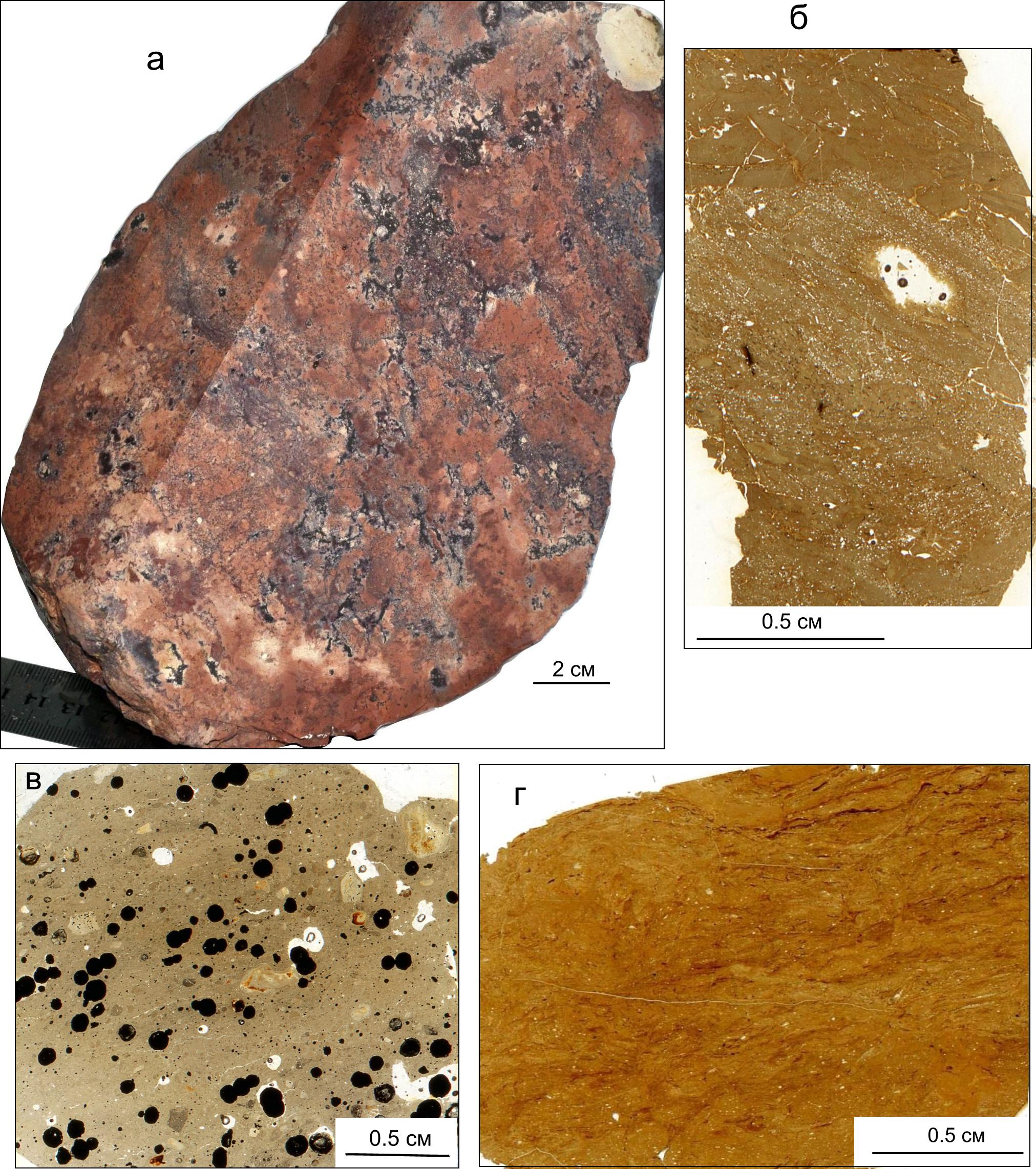 Не отчетливо выраженные слойки обнаруживаются в срезах штуфных образцов аргиллитов (флинтклейнов) (рис. 7, е; 9, а). Зачаточная слоистость подчеркнута чередованием тонких согласно ориентированных сиреневых слойков (полос?) толщиной 3–6 мм и розовых – 15–25 мм (рис. 9, а). Подобные текстуры наблюдаются и в шлифах (рис. 6, в; 9, в). Эти текстуры близки определению «слоеватость» по Н.Б. Вассоевичу. В шлифах выявлены текстуры, похожие на микрокосослоистые (рис. 9, б) и микроволнистые (?) (рис. 9, г). Косая слоистость подчеркнута распределением обломочного кварца тонкопесчаной размерности в слойках миллиметровой толщины. Слойки с алевритовой примесью отделены друг от друга еще более тонкими глинистыми слойками. Микроволнистая (?) текстура выражена распределением прерывистых, изогнутых тонких глинистых слойков темно-коричневого цвета с пелитоморфной структурой в более светлой фоновой глинистой массе. Последняя включает глинистые комки псаммитовой размерности и редкие кварцевые зерна алевритовой размерности. Микроволнистость (?) нарушена следами илоедов (?), направленных перпендикулярно слоистости (рис. 9, г).