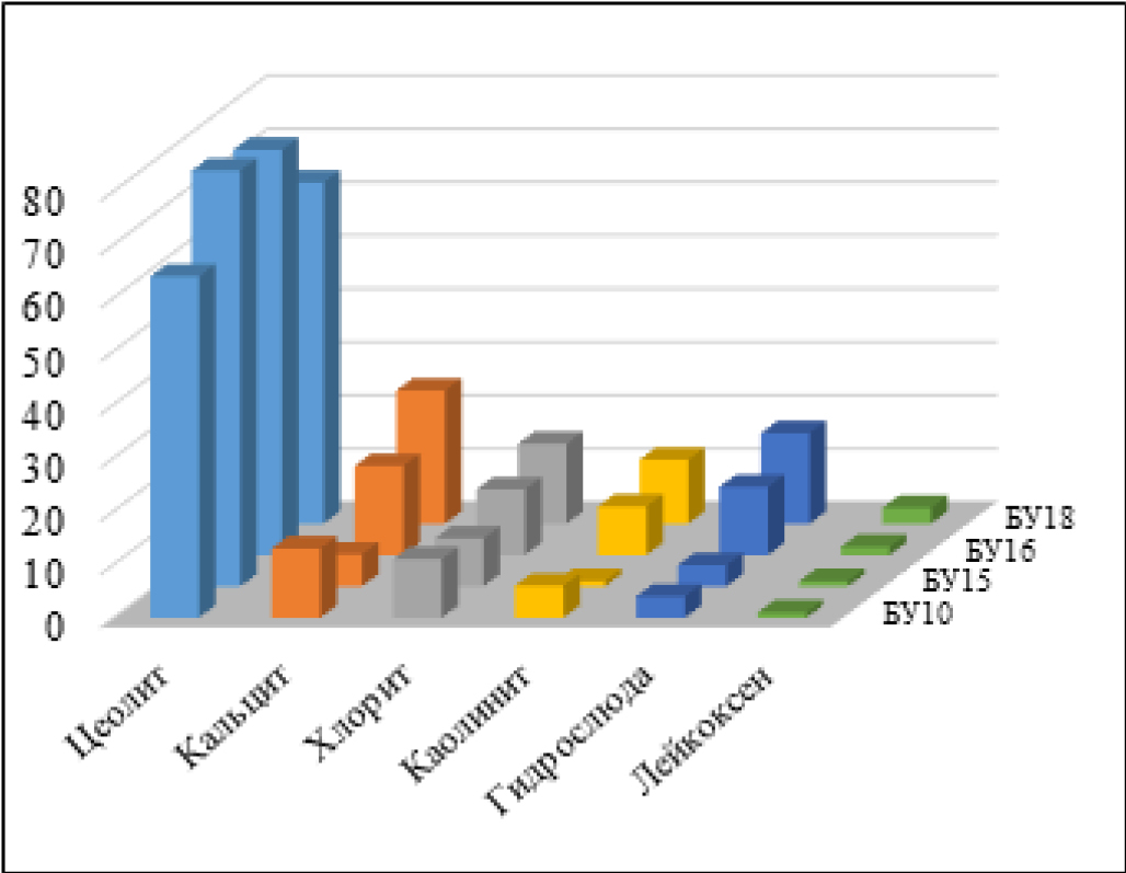Наряду с цеолитами широко распространены в качестве цементирующего вещества хлорит (до 6 %), каолинит (до 4 %), гидрослюда (до 2 %, в единичных случаях – до 7 %) и кальцит (до 2 %, иногда достигает 35 %).