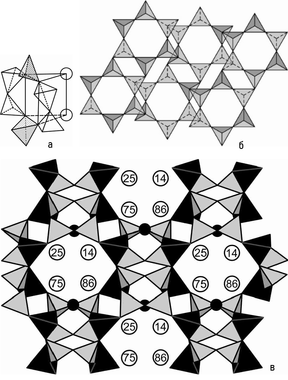 Рисунок 5. Структура ломонтита: а) тригональная призма Ca2+ c 4О+2Н2О в вершинах (Si2O7 – группы светлые, AlO4 – тетраэдры темные, Н2О – светлые кружки); б) конденсация искаженных волластонитоподобных цепочек в ленты из шести- и четырехзвенных колец, сконденсированных в гофрированные слои; в) каналы из восьмерных колец AlO4– и SiO4–тетраэдров с Ca2+ (черные кружки) и Н2О (светлые кружки с цифрами, обозначающими относительную высоту), AlO4–тетраэдры затемнены.