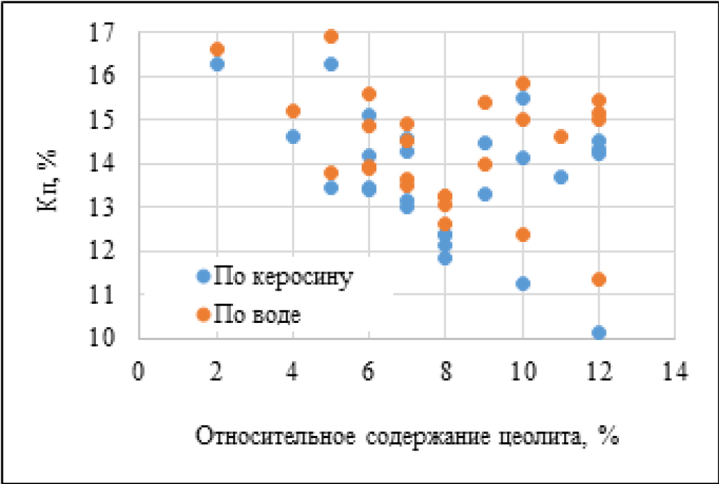 Наличие ломонтита в коллекторах Пякяхинского месторождения напрямую влияет на метод водо/керосинонасыщения, при котором происходит завышение уровня пористости (Кп) на 2–5 % (рис. 6), связанное со способностью ломонтита поглощать молекулы воды, меньшие по своим размерам по сравнению с молекулами углеводородов. Следовательно, построение петрофизических моделей цеолитсодержащих коллекторов должно осуществляться по результатам оценки Кп керосинонасыщением, поскольку при оценке Кп водонасыщением будет завышаться значение коэффициента пористости, что может привести к ошибке в оценке величины запасов углеводородов.