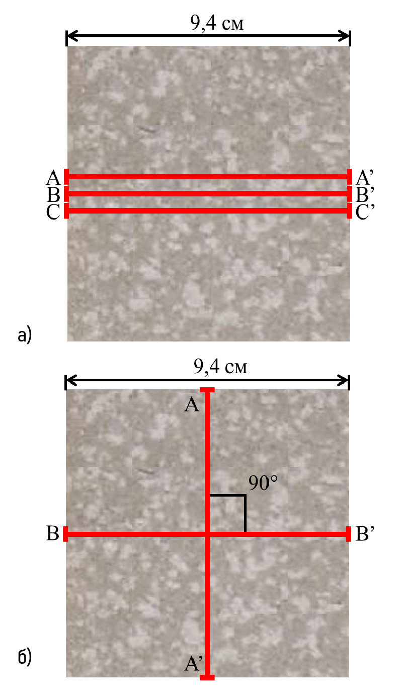 Линейный метод: подсчет цеолитизации по трем параллельным линиям с последующим вычислением среднего арифметического и привязки глубины полученного результата к средней линии B-B’ (рис. 7, а). Перекрестный метод: подсчет цеолитизации по двум перпендикулярным линиям и привязки глубины результата к поперечной линии B-B’ (рис. 7, б).