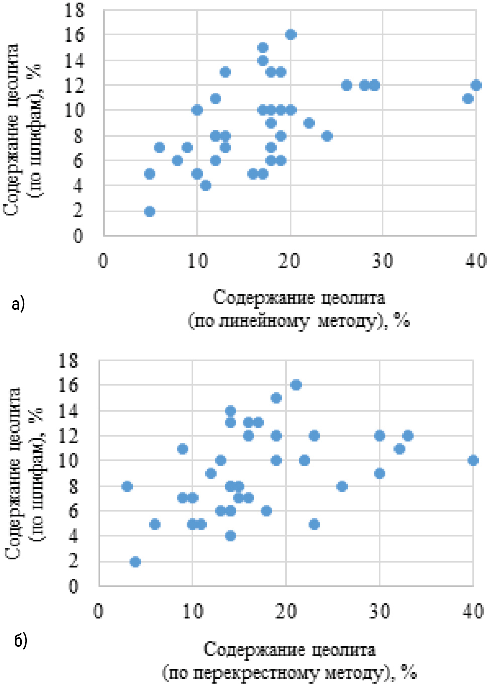 Рисунок 8. Сопоставление содержания цеолита по шлифам с линейным (а) и перекрестным (б) методами (скважина № 3 Пякяхинского месторождения).