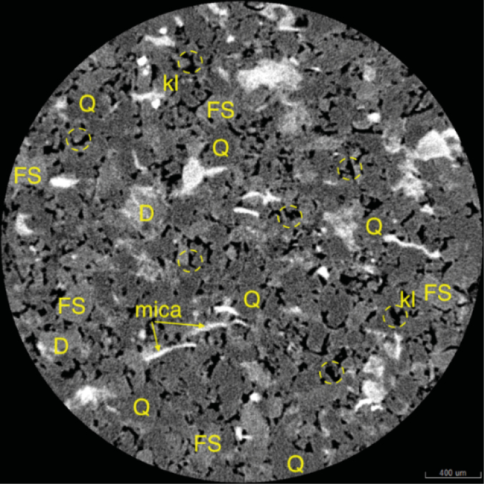 Рисунок 9. Рентгеноплотностной срез образца с интерпретацией: Q – кварц, FS – полевые шпаты, D – обломки пород, kl – каолинит, mica – слюда, желтым пунктиром отмечены поры.