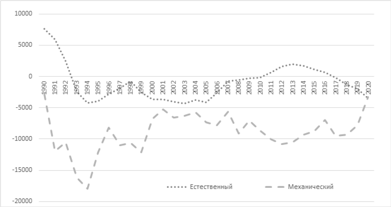 За 1990–2020 гг. 90,2 % уменьшения численности населения пришлось именно на миграционную убыль, и лишь оставшиеся 9,8 % – естественная убыль. В настоящее время наблюдается тенденция роста естественной убыли, в 2020 г. она превысила миграционную (3479 и 3324 чел. соответственно).