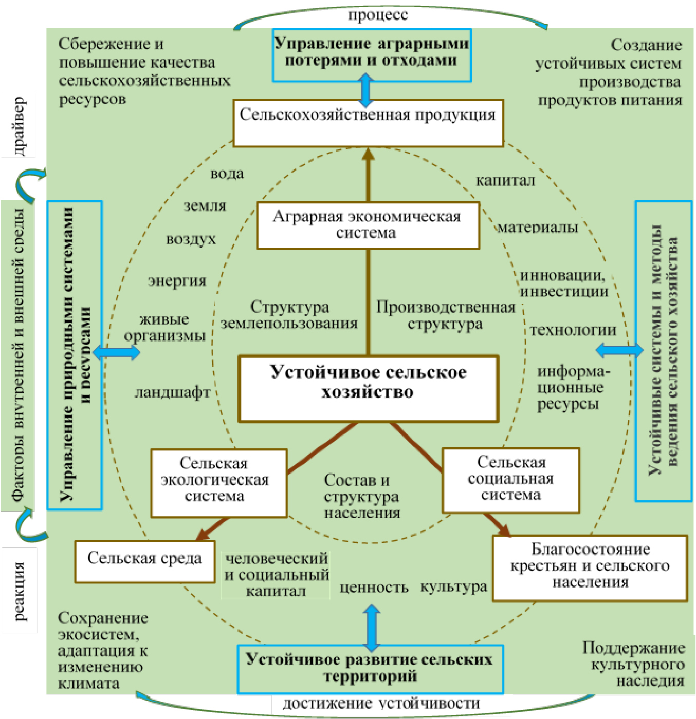 Устойчивое развитие – это сложный процесс, включающий множество факторов, которые в широком смысле соответствуют экономическим, социальным и экологическим областям. Устойчивость сельского хозяйства зависит от состояния факторов внешней и внутренней систем, включая выявление и управление уязвимостями, адаптацию (способность, потенциал) аграрного производства и его трансформацией.