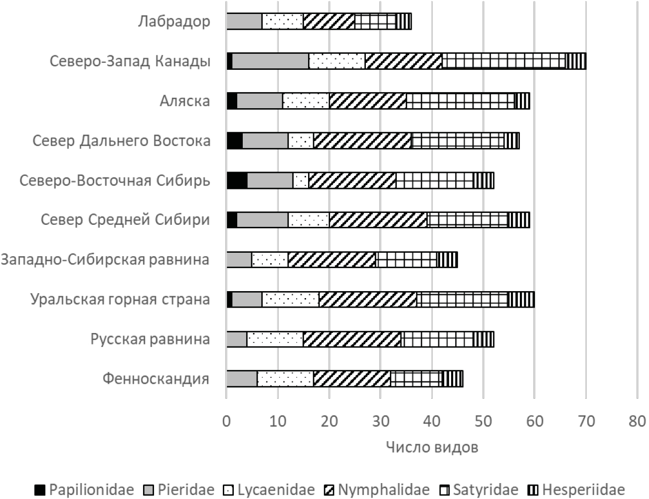 Видовое богатство Papilionoidea региональных гипоарктических фаун составляет в среднем около 50 коренных видов (таблица). Меньше всего установлено видов булавоусых чешуекрылых на севере Лабрадора (36), наиболее богатыми, по нашей оценке, оказались региональные фауны Северо-Запада Канады (66), Урала (60), севера Средней Сибири (59), Аляски (56) и севера Дальнего Востока (56). Данные показатели зависят, прежде всего, от ландшафтно-зональной структуры территорий, уровня их антропогенного освоения и, естественно, несут следы влияния на формирование фаун поэтапного и разнонаправленного природного процесса в позднеледниковье и голоцене.