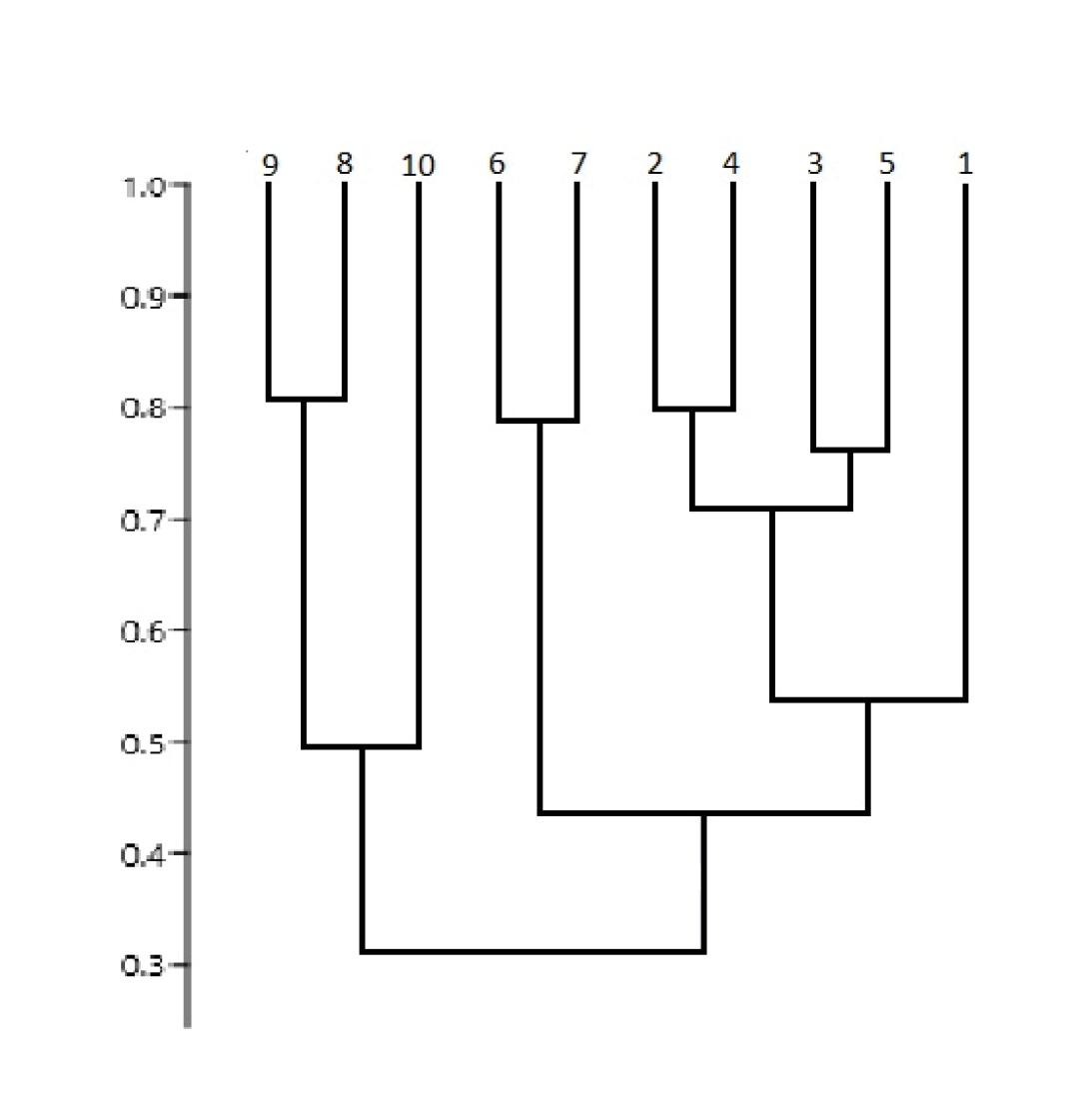 Рисунок 2. Дендрограмма сходства видового состава гипоарктических фаун булавоусых чешуекрылых: 1 – Фенноскандия; 2 – Русская равнина; 3 – Урал; 4 – Западно-Сибирская равнина; 5 – север Средней Сибири; 6 – Северо-Восточная Сибирь; 7 – север Дальнего Востока; 8 – Аляска; 9 – северо-запад Канады; 10 – Лабрадор.