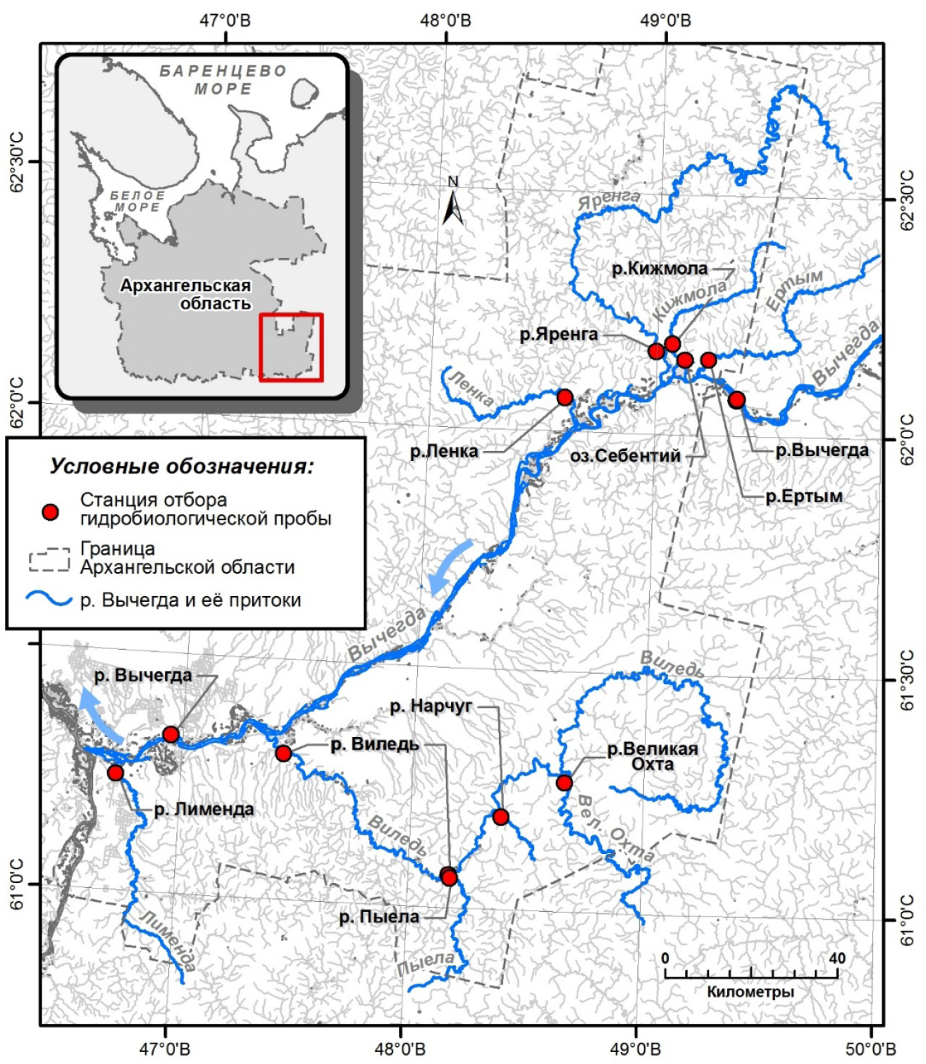 Экосистемы р. Вычегды и ее притоков, протекающих по территории Архангельской области, изучены очень слабо, сведений о них в литературе практически не встречается. В 2021 г. Северный филиал ФГБНУ «ВНИРО» провел исследования нижнего течения Вычегды, ее притоков и одного пойменного озера в границах Архангельской области. Изучался состав бентофауны, а также оценивалось экологическое состояние водных объектов, условно принимаемое как фоновое. Оценка экологической ситуации на водных объектах выполнялась по показателям развития зообентоса. Пробы отбирались на наиболее стабильных участках русла (в основном на каменистых перекатах), где состав донного населения наиболее разнообразен и дает наиболее полное представление о состоянии водного объекта [1].