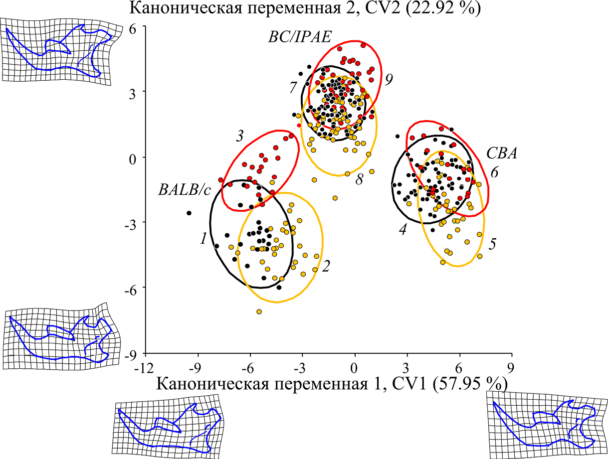 Рисунок 3. Результаты канонического анализа прокрустовых координат, характеризующих изменчивость формы нижней челюсти контрольных (1, 4, 7) и экспериментальных: «диета-1» (2, 5, 8) и «диета-2» (3, 6, 9) групп линейных мышей BALB/с (1–3), CBA (4–6) и BC/IPAE (7–9) вдоль CV1 и CV2. Контурные изображения (outlines) мандибул, вписанные в деформационные решетки вдоль канонических осей, соответствуют их минимальным и максимальным значениям. Эллипсоиды рассеивания ординат объединяют 95 % дисперсии выборок.
