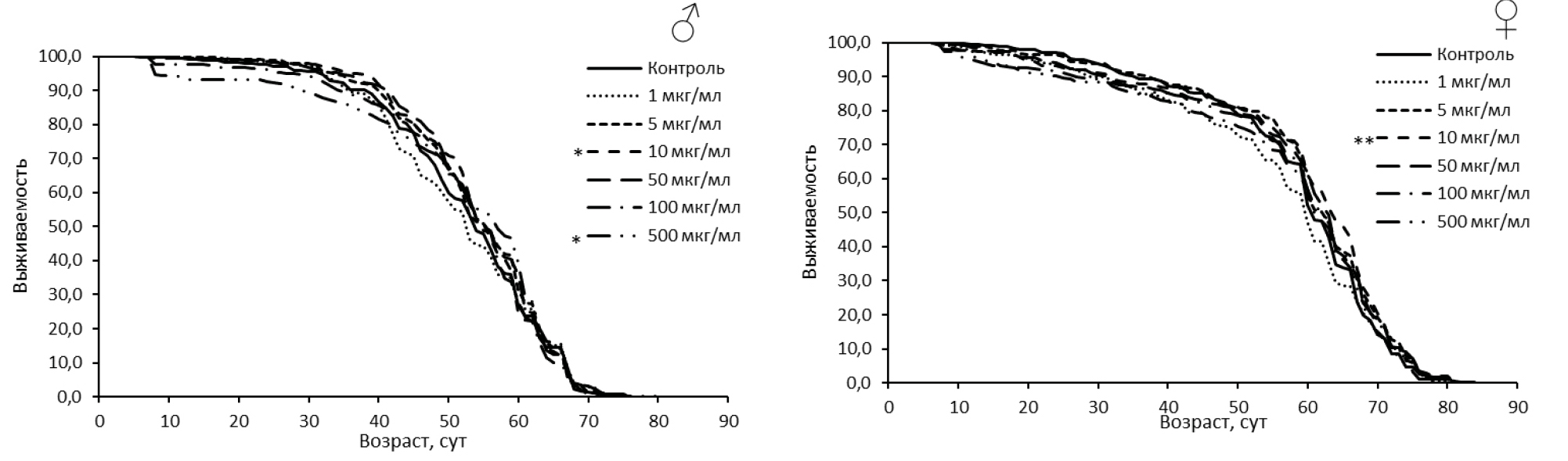 Figure 1. Survival curves for male (A) and female (Б) Canton-S Drosophila melanogaster treated with enoxacin.