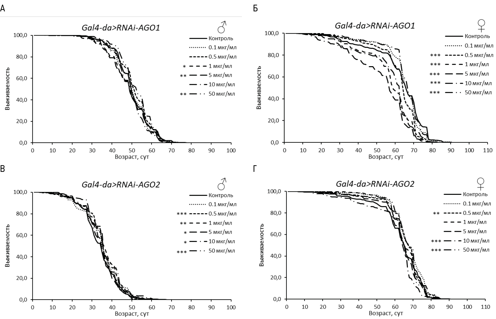 В то же время у дрозофил без нокдауна генов Argonaute наблюдали снижение параметров ПЖ на 1–35 % (p < 0.05) во всех исследуемых концентрациях.