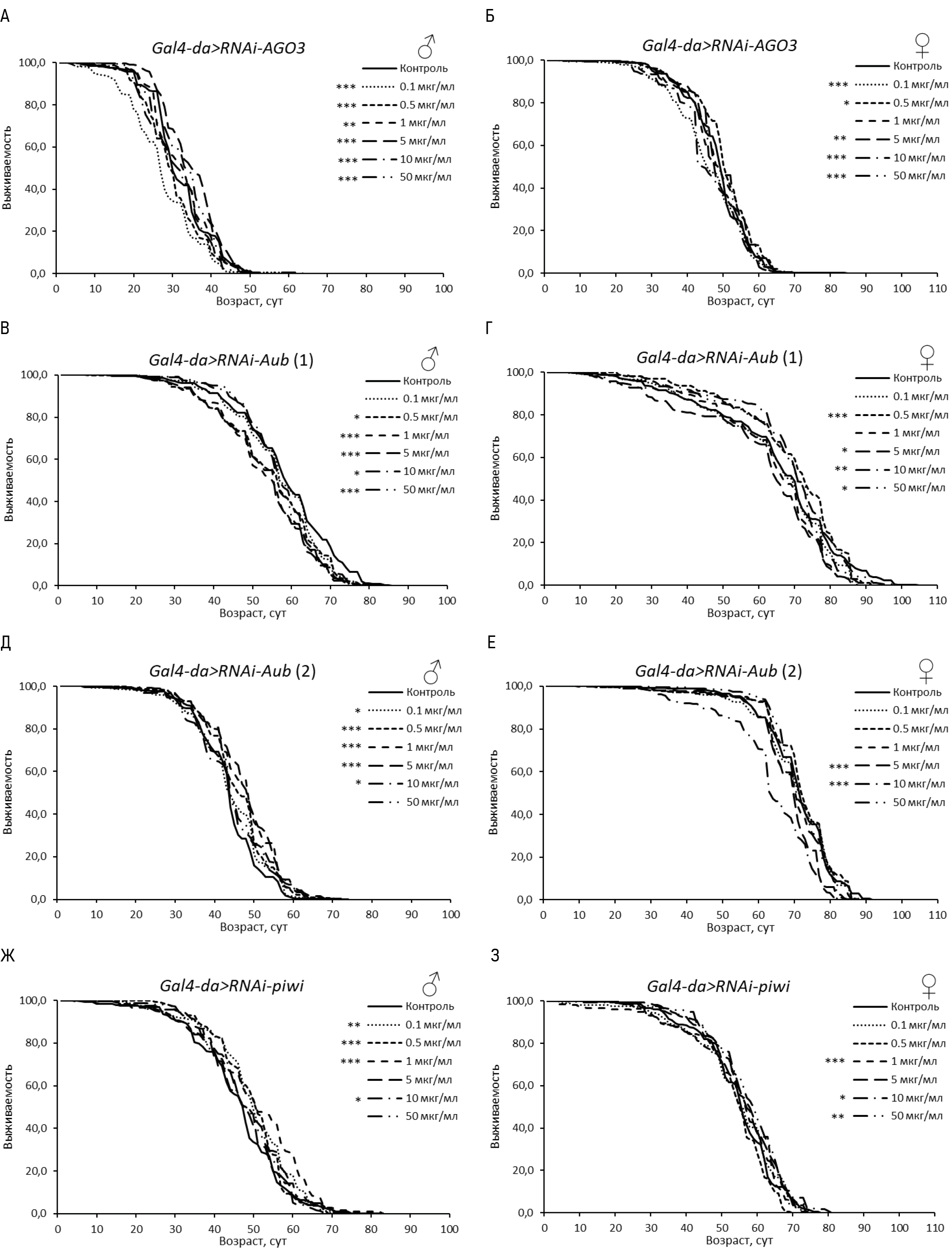 У самцов с нокдауном гена AGO2 обнаружен положительный эффект эноксацина в концентрациях 1, 10 и 50 мкг/мл в одной из повторностей (табл. 3, рис. 2). Также увеличение ПЖ при потреблении эноксацина наблюдали у мух с РНК-интерференцией aub(2) (при 0.5–50 мкг/мл вещества) и piwi (при 0.1–1 мкг/мл) (табл. 3, рис. 3). В перечисленных случаях медианная ПЖ была увеличена на 6–23 % (p < 0.05), а возраст 90 % смертности – на 5–23 % (p < 0.05). Эти данные указывают на то, что активность генов AGO2, aub и piwi у самцов не снижает эффект эноксацина по сравнению с линией дикого типа.