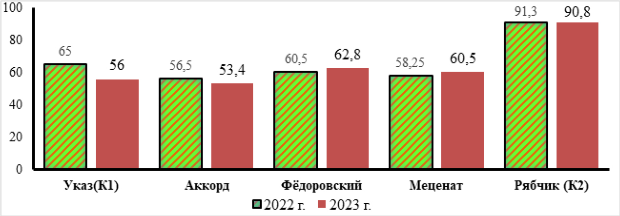 Усредненная урожайность зеленой массы бобовых в 2023 г. уменьшилась на 6 % и составила 57.8 т/га по сравнению с предыдущим годом – 61.6 т/га. В целом по урожайности сортов люпина сохранилась та же тенденция, что и годом ранее – достоверная прибавка урожайности по сравнению с контролем: Указ – на 39.7–70.2 % и Рябчик – на 19.2–45.2 %.