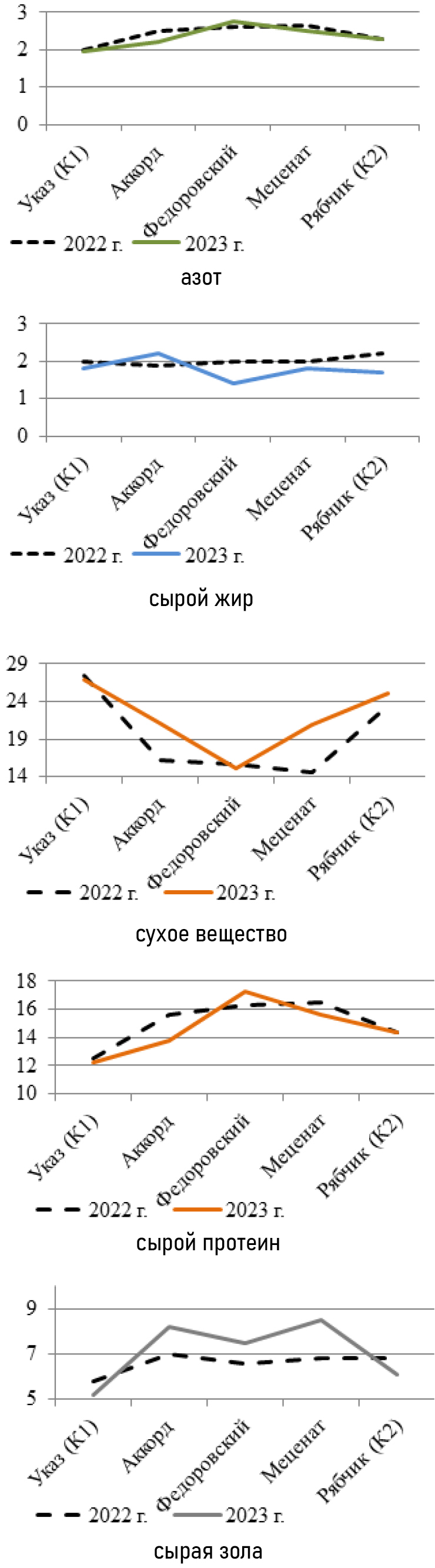 Наименьшее содержание сырой золы (5.8%) в 2022 г. отмечено у контроля Указ. У сортов люпина селекции Ленинградского НИИСХ уровень данного показателя достиг 6.6–6.8 %. В 2023 г. наблюдали такую картину: в контрольных вариантах содержание золы понизилось на 10 %, или в абсолютных единицах на 0–0.7 %, а у сортов люпина возросло на 14–25 %.