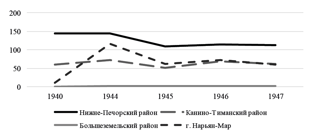 Большая часть пахотных земель преобладала в Нижне-Печорском районе и г. Нарьян-Маре, что связано со сосредоточением основной части населения, в том числе и пришлого. Меньшие площади пахотных земель с более благоприятными условиями для земледелия находились в западной части Канино-Тиманского района и были обусловлены невысокой численностью населения и маломощными колхозами. В Большеземельском районе округа, отличающемся более суровыми условиями от других районов и занятием населения традиционным ведением хозяйствования, попытки земледелия отмечены только с 1944 г.