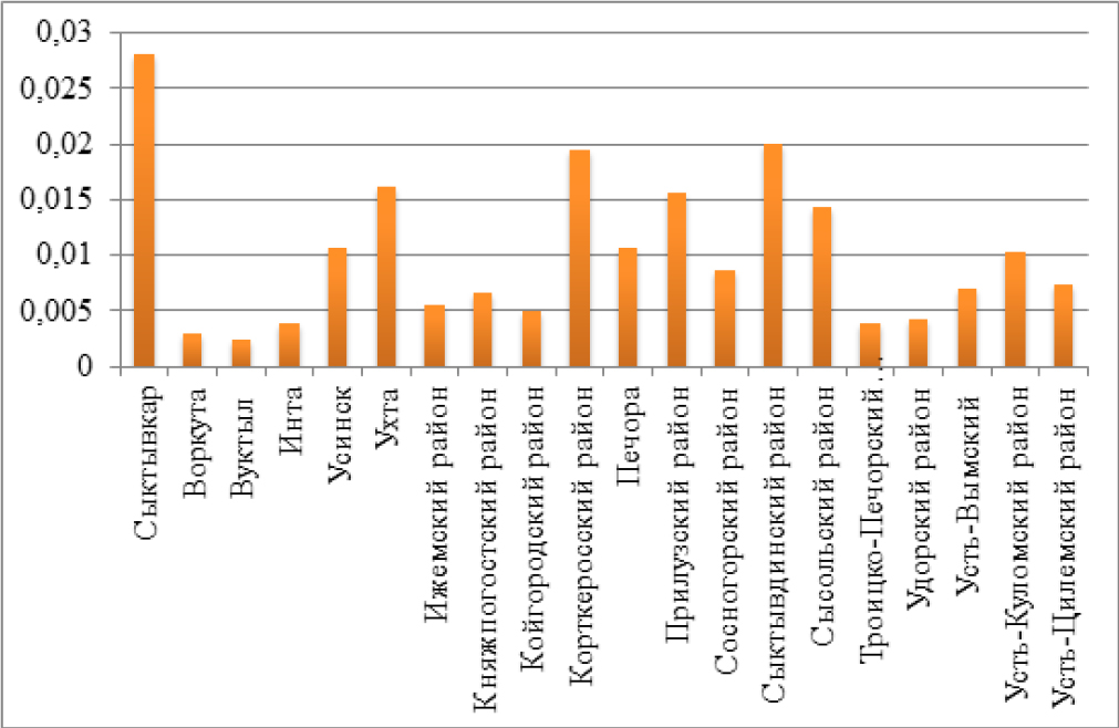 Корткеросский район | 0.0180 | 3 | 0.0013 | 10 | 0.0002 | 6 | 0.0195 | 3 |