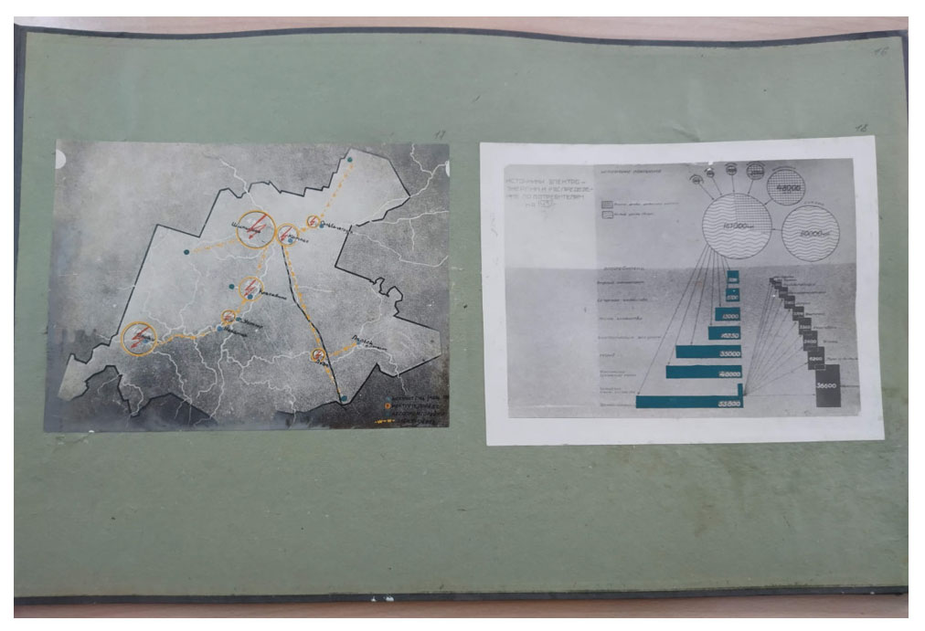 Photo 2. Map and scheme “Sources of electricity and distribution to consumers for 1937” (View of the arrangement of photographs on an album sheet)