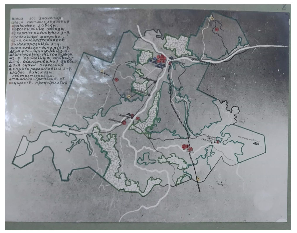 Примечание. На картосхеме знаковыми обозначениями отмечены леса государственного и местного значений, существующие предприятия и намеченные к строительству леспромгородки, машинотракторные станции, мебельные фабрики, заводы: фанерные, лесопильные, соломорубильные, стеноматериалов, шпалорезный, целлюлозно-бумажный, канифольно-экстракционный, дубильных экстрактов, осахаривания древесины, сухой перегонки, спирто-порошковый, вискозы.