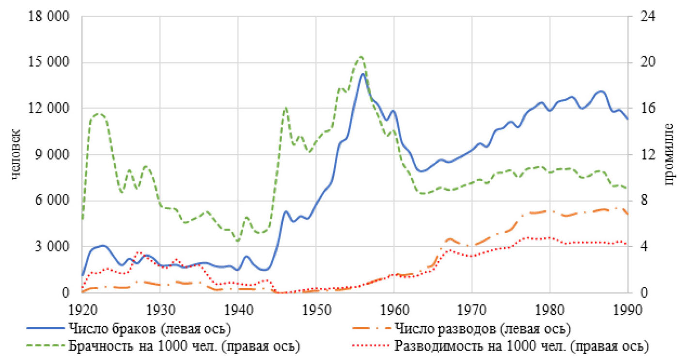 Marriage and divorce rates of the population of the Komi Republic in the 1920s-1980s