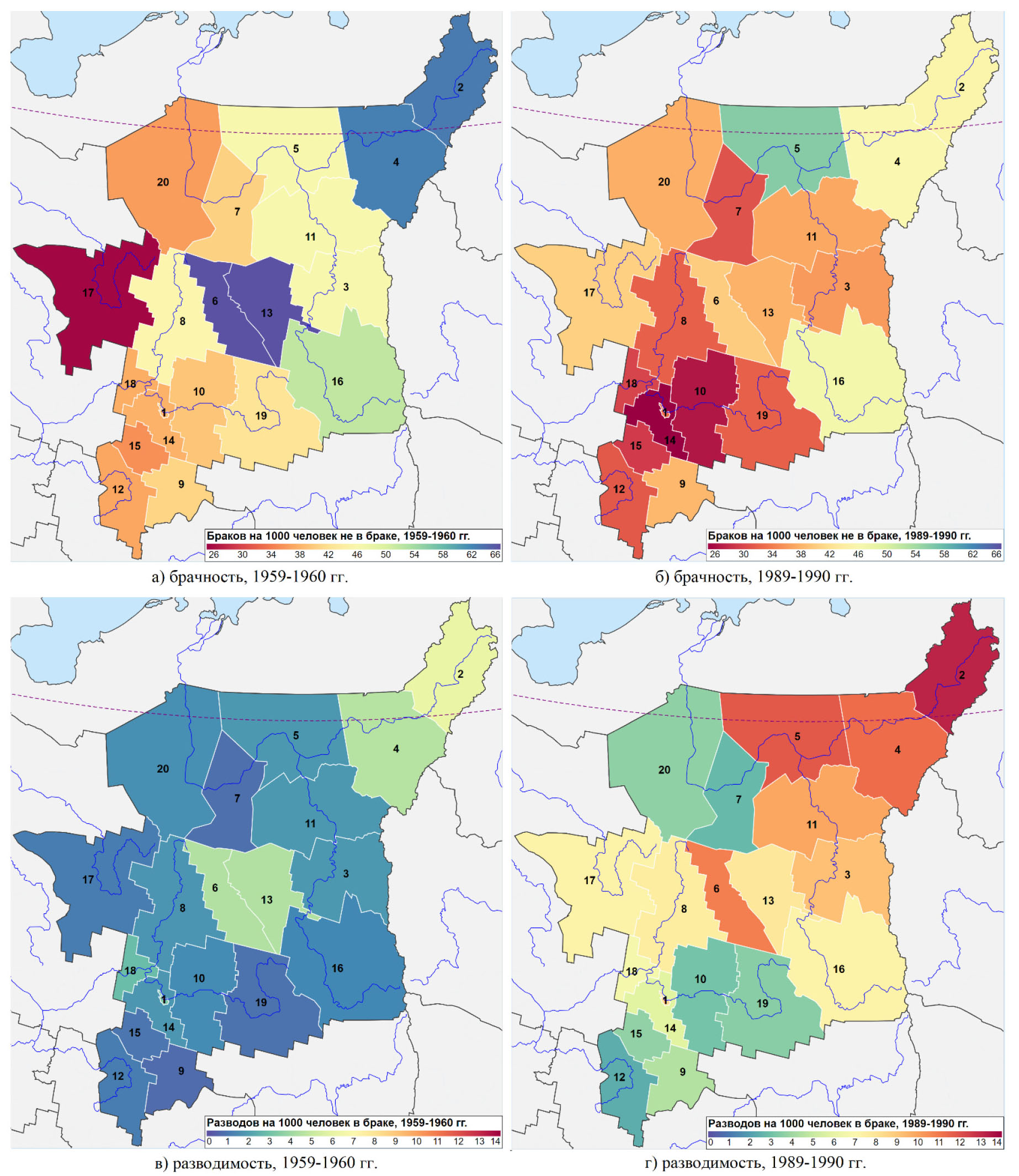Сравнивая динамику брачности с динамикой рождаемости [22, 23], можно сделать вывод, что эти два процесса в Коми крае часто шли рука об руку. За повышением уровня брачности часто, хотя и далеко не всегда, следовало некоторое увеличение интенсивности рождений. Для более полного понимания процессов брачности и разводимости рассмотрим их пространственные особенности.