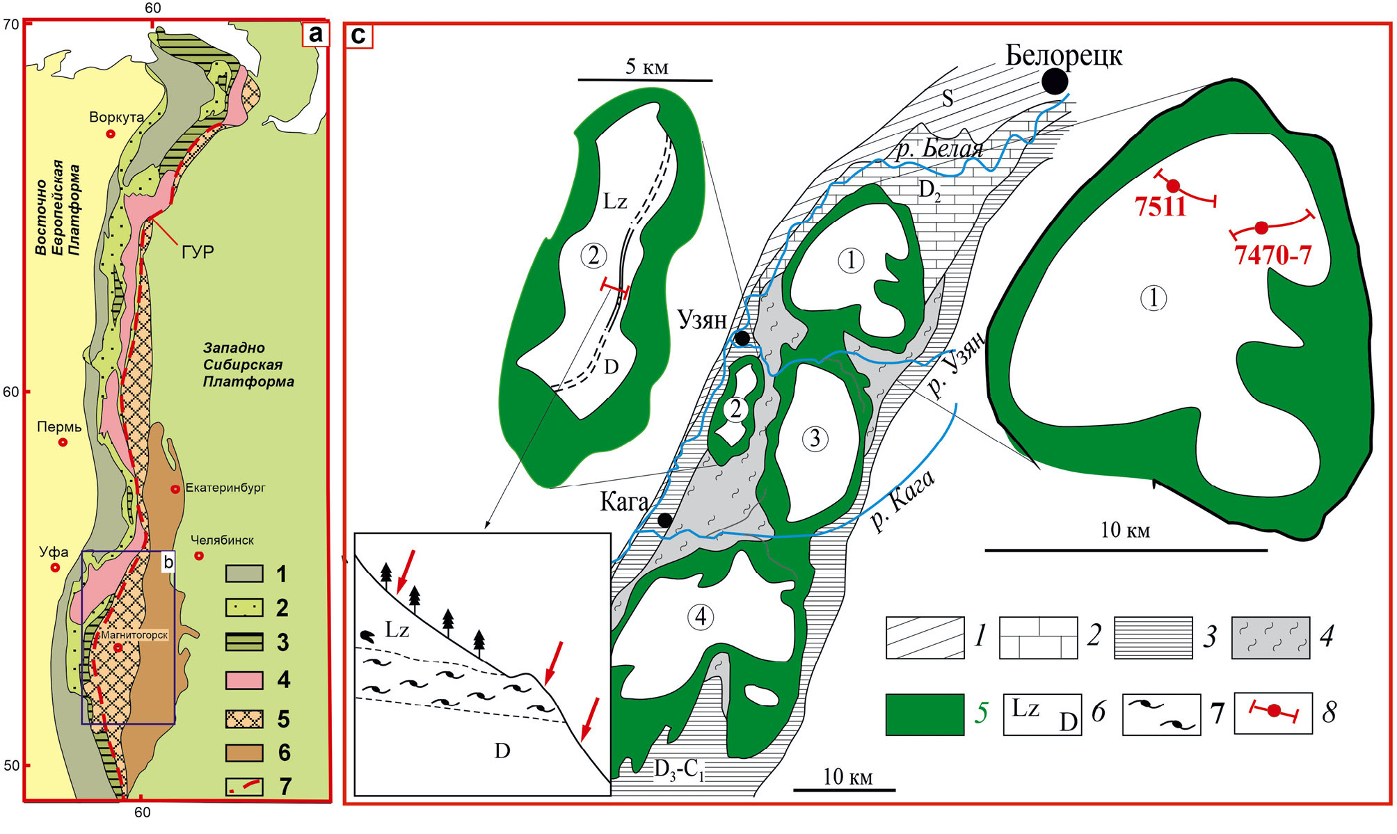 Условные обозначения: a) 1 – Предуральский краевой прогиб; 2 – Западно-Уральские шельфовые отложения; 3 – Западно-Уральские батиальные отложения; 4 – Центрально-Уральская зона; 5 – Тагило-Магнитогорская зона; 6 – Восточно-Уральская зона; 7 – Главный Уральский разлом; c) 1–2 – силурийские и девонские комплексы континентального склона; 3 – отложения зилаирской серии (D3fm-C1t1), включающие кварцевые песчаники, граувакки, глинистые сланцы и известняки; 4 – серпентинитовый полимиктовый меланж; 5 – аподунитовые серпентиниты; 6 – гипербазиты (Lz-лерцолиты, D-дуниты); 7 – гранатовые пироксениты; 8 – профили мест отбора образцов для датирования U-Pb SHRIMP-II и 147Sm-144Nd ID-TIMS методами изотопной геологии. Цифрами в кружках обозначены массивы Кракинской группы: 1 – Северный, 2 – Узянский, 3 – Средний, 4 – Южный Крака. Стрелками во вставке (левая нижняя часть рисунка) обозначены места отбора проб, из которых были выделены цирконы для U-Pb SHRIMP-II датирования.
