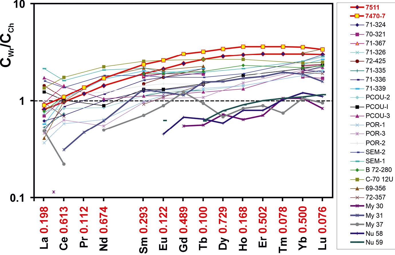 Figure 3. REE distribution patterns in lherzolites [7] with additions. Thin colored lines are classic lherzolites of the Eastern Pyrenees, sample numbers (71- 324, ...,72-357) correspond to those in Tables 1A, 1B, 1C [13]. Red bold lines characterize the REE distribution spectra of samples 7511 (blue rhombs) and 7470-7 (yellow squares) studied in this work. The least bold colored lines are lherzolites of the Mindyak and Nurali massifs, Southern Urals. Sample numbers correspond to those in Table 1 [14]. CWr, CCh – REE concentrations in rock and chondrite, respectively. Normalization coefficients are indicated in red numbers on the x-axis