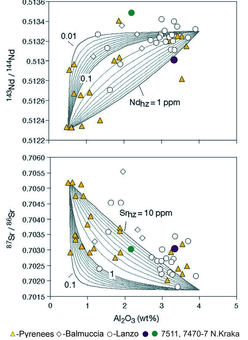 Figure 6. Dependences of 143Nd/144Nd, 87Sr/86Sr on Al2O3 (wt. %) for orogenic peridotites from the Pyrenees massifs and Western Alps and spinel lherzolites of the Northern Kraka massif [1, 15-24]. Elemental and isotopic compositions of end-members: Al2O3=4 %, Nd=0.7 ppm, Sr=12 ppm, 143Nd/144Nd=0.5133 and 87Sr/86Sr=0.7017 for lherzolite and Al2O3=0.5 %, Nd varies from 0.01 to 1 ppm, Sr=0.1 to 10 ppm, 143Nd/144Nd=0.5123 and 87Sr/86Sr=0.7052 for harzburgite