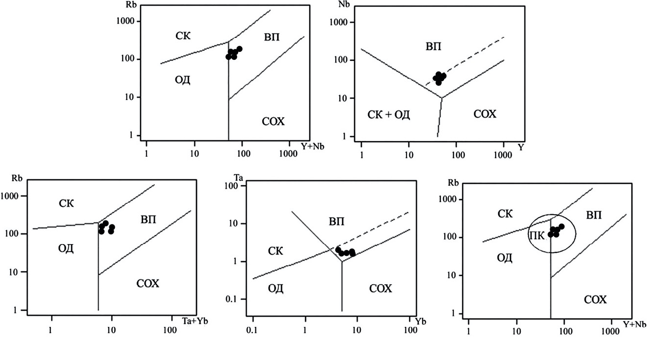 Figure 7. Diagrams by J. A. Pearce for granites of the Kozhim massif: СК – syncollisional; ПК – postcollisional, ВП – intraplate, OД – island-arc, COX – granites of mid-oceanic ridges