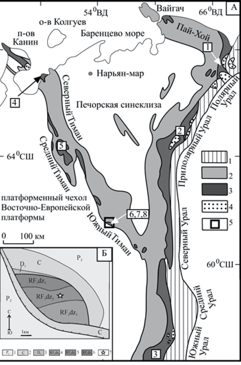 Figure 1. A. Sketch-map of the geological structure of the Timan-North-Ural region (according to: [11, P. 741–760]): 1, 2 – Paleozoic formations of the Urals and Timan: 1 – paleooceanic, 2 – paleocontinental; 3 – Upper Proterozoic formations; 4 – Lower Precambrian metamorphic complexes; 5 – study areas. Figures in rectangles are sampling locations (graphs are shown in Figure 4): 1 – № 4–28 [12, P. 488–492]; 2 – № 28 [11, P. 741–760]; 3 – № K-12-057 [13, P. 642]; 4 – № 202 [14, P. 14–26]; 5 – [15, P. 384–389]; 6 – № K-21-137 [16, P. 166-169]; 7 – № K-21-142 [16, P. 166–169]; 8– № VAD-1 (our data). Б. Geological sketch-map of the Nemskaya Upland