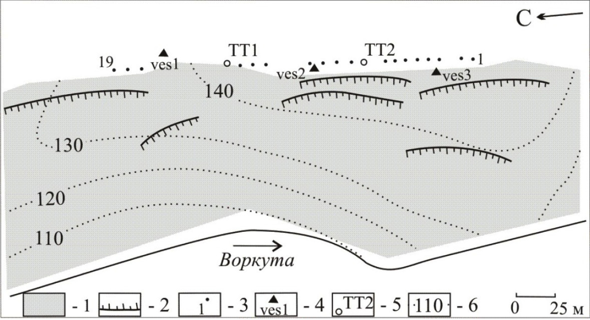 Рисунок 1. Схема района исследований: 1 – оползневый участок, 2 – бровка оползневого срыва, 3 – геодезический репер, 4 – пикет вертикального электрического зондирования, 5 – термометрическая скважина, 6 – абсолютная высота