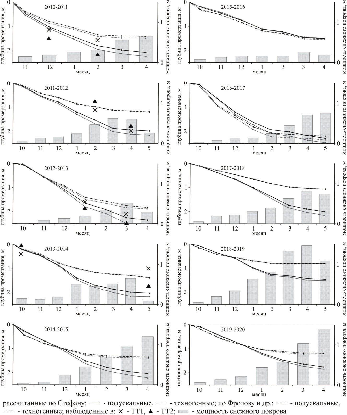 Расчеты глубины промерзания осуществляли на основе задачи теплопроводности трехслойной среды (снег, мерзлые и талые породы) с фазовым переходом на границе мерзлого и талого грунтов по [26]. В расчетах принято, что температура в каждой из сред изменяется линейно. Уравнение теплового баланса, лежащее в основе расчетов, включает энергию фазового перехода, приток тепла из немерзлого грунта и отток в мерзлый грунт и атмосферу.
