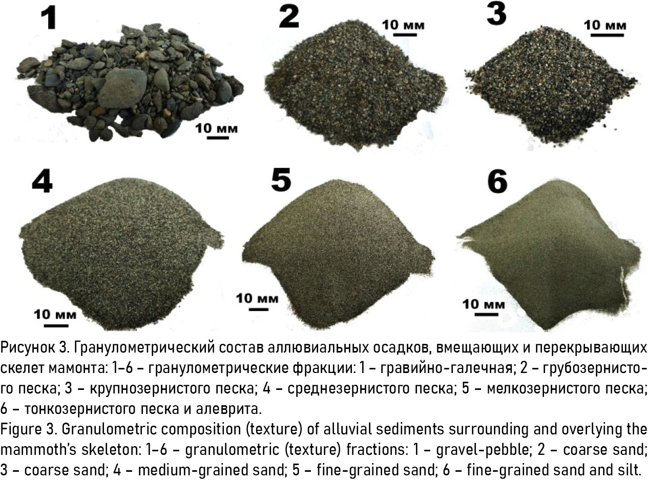 Сохранившийся на скелетизированных остатках мамонта грунт характеризуется галечно-песчаным гранулометрическим составом (содержание фракций в вес. %): гравийно-галечный материал (+2 мм) – 23.9; песок грубозернистый (–2+1 мм) – 11.81; песок крупнозернистый (–1+0.5 мм) – 2.75; песок среднезернистый (–0.5+0.25 мм) – 30.65; песок мелкозернистый (–0.25+0.1 мм) – 22.81; песок тонкозернистый и алеврит (–0.1 мм) – 8.71 (рис. 3). Судя по гранулометрии, налипший на костные остатки грунт вполне соответствует речным осадкам.