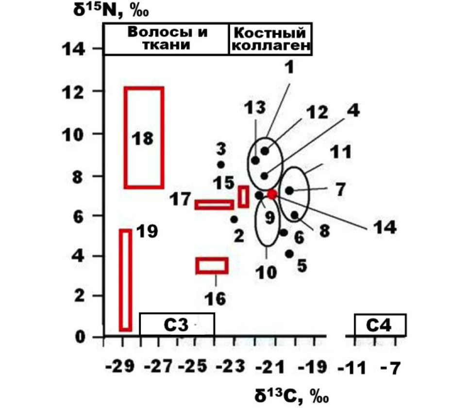 - Iacumin, P. Spatial and temporal variations in the 13C/12C and 15N/14N rations of mammoth hairs : Palaeodiet and Palaeoclimate implications / P. Iacumin, C. Devanzo, V. Nikolaev // Chemical Geology. – 2006. – № 231. – P. 16–25.
