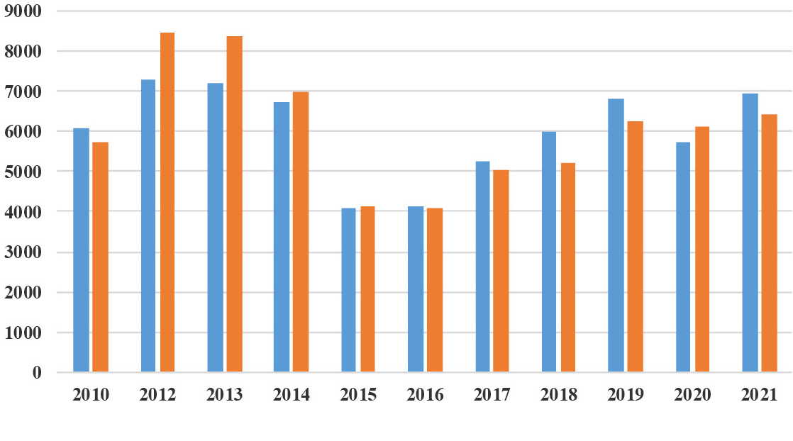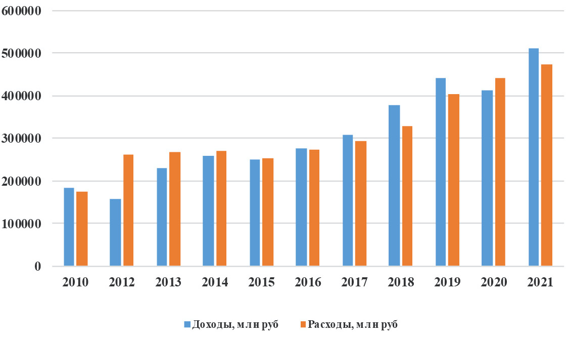 Рассмотрим результаты реализации бюджетной политики в арктических регионах РФ. Рисунок 1 демонстрирует рост совокупных доходов и расходов региональных бюджетов на протяжении всего периода с 2010 по 2021 г., с небольшим снижением показателей в 2015 г., что может свидетельствовать о росте экономического благосостояния территорий.