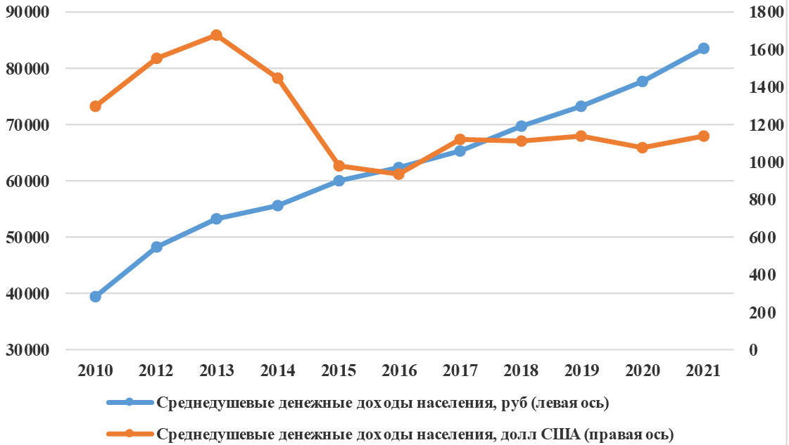 На рис. 4 показана положительная динамика среднедушевых доходов населения арктических регионов, представленных в рублевом эквиваленте. Вместе с тем, с учетом изменения курса рубля тенденция роста среднедушевых доходов не прослеживается. Существенное сокращение величины показателя начало отмечаться с 2014 по 2016 год. В течение всего анализируемого периода 2016 г. отмечен наименьшим уровнем среднедушевых доходов. В 2017 г. обозначился незначительный рост показателя, уровень которого практически не менялся (с небольшими колебаниями) на протяжении последующих четырех лет и определился к 2021 г. в размере в 1,5 раза меньше относительно его максимальной величины, зафиксированной в 2013 г. в условиях высоких цен на нефть и до введения масштабных антироссийских санкций. Можно констатировать, что при исчислении среднедушевых доходов населения в рублях показан рост данного показателя, но при пересчете его по курсу доллара отмечен нисходящий тренд, что свидетельствует о снижении уровня благосостояния граждан арктических регионов в глобальном измерении.