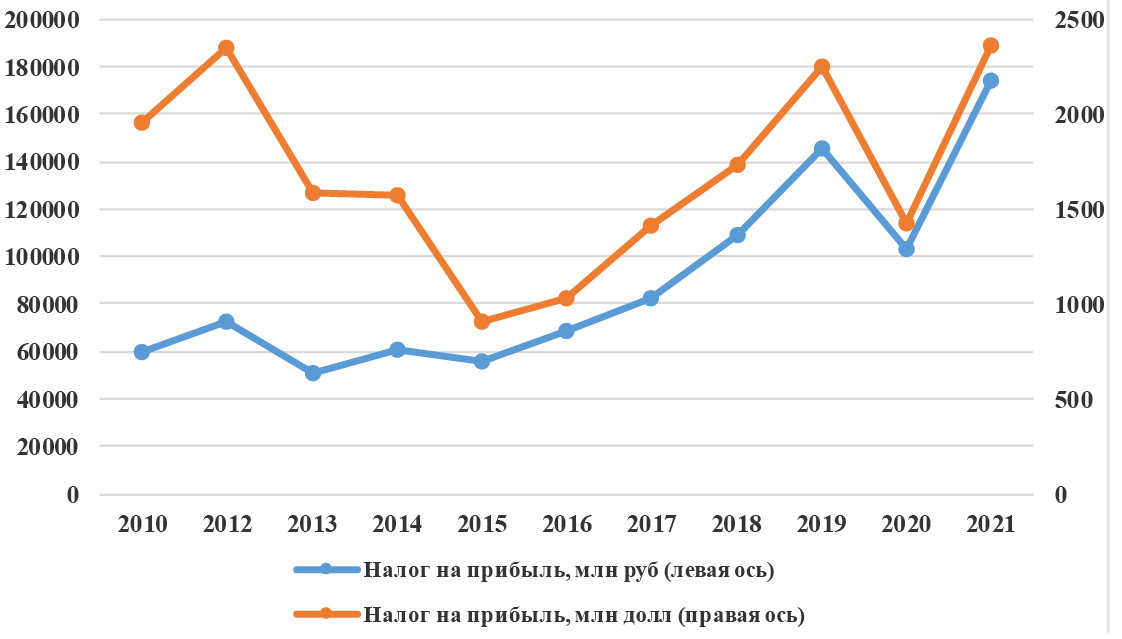 При сравнении «поведения» кривых налога на прибыль по арктическим регионам (рис. 6) и России (рис. 7) можно заметить расхождения их максимальных значений: по Российской Федерации – 2012 г., по арктическим регионам – 2021 г.
