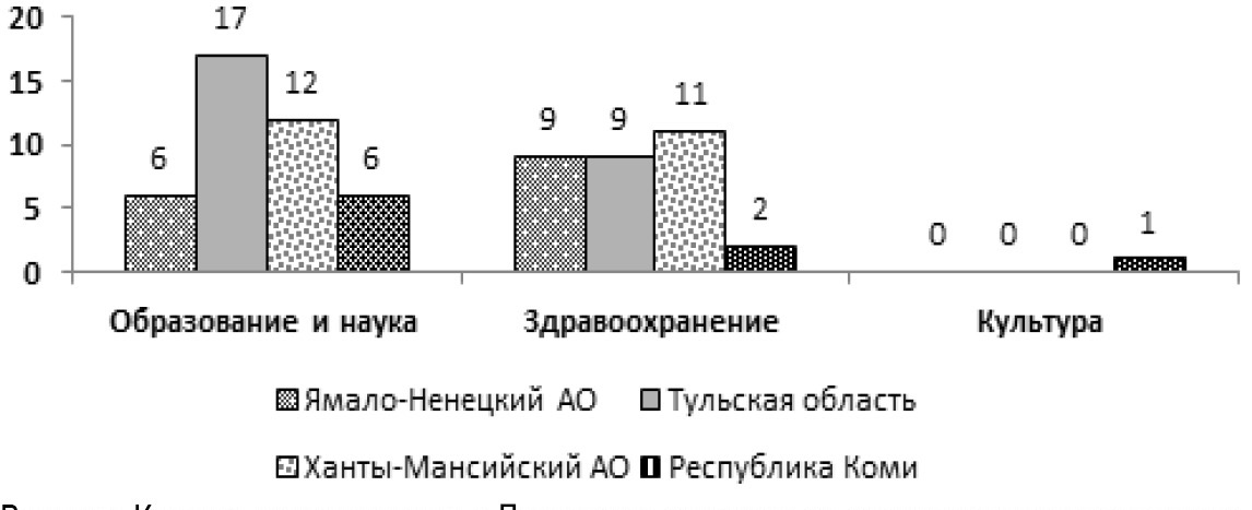 Наибольшее количество проектов социальной сферы в Тульской области приходится на образование и науку – 17 проектов. В Ханты-Мансийском АО примерно одинаковое количество проектов в отраслях образования и здравоохранения – 12 и 11 соответственно. В Ямало-Ненецком АО количество проектов в отрасли здравоохранения на три больше, чем в отрасли образования – девять. Республика Коми имеет наименьшее количество проектов: шесть – в образовании, два – в здравоохранении.