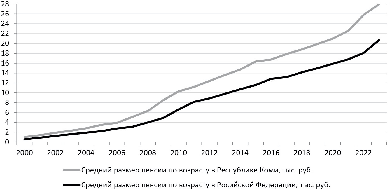 К экономическим аспектам постарения, безусловно, следует также относить вопросы достойного пенсионного обеспечения людей, которые не только построили экономику страны, но и на протяжении нескольких десятилетий делали пенсионные отчисления. Необходимо отметить, что в 2000-х гг. пенсии по старости росли в России в два раза быстрей средней инфляции потребительских цен. До 2010 г. увеличение пенсий шло сильно опережающими темпами, затем замедлилось, но продолжало оставаться выше инфляции. Самый низкий темп прироста среднего размера пенсии по старости характерен в России для 2017 г. [19, с. 98]. По всей видимости, это связано с отменой индексации работающим пенсионерам. После этого прослеживается возрастающий тренд темпов прироста. За 2000–2023 гг. средняя пенсия увеличилась в стране почти в 38 раз. Россия является лидером на постсоветском пространстве по их размеру. В Республике Коми средний размер пенсии по старости стабильно выше, чем в целом по стране, и опережение в последние годы увеличивается (рис. 2), что отчасти компенсирует высокую стоимость жизни на Севере.