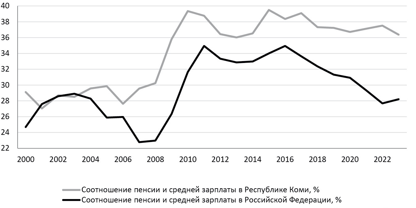 Figure 3. The ratio of the average old-age pension to the average wage in Russia and the Komi Republic in 2000–2023 (at the beginning of year), % [9, 29–32].