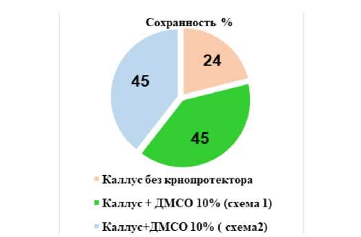 Благодаря тому, что отечественные лаборатории и многие исследовательские центры обладают довольно неплохим лабораторным оборудованием, сегодня предоставлена возможность проводить любые опыты и исследования. В частности, многие исследователи получили возможность разрабатывать новые протоколы для заморозки культур клеток без применения жидкого азота. Поэтому цель данной работы – оценить эффективность применения криопротектора (ДМСО) для сохранения каллусных клеток при температуре -80 °С в условиях бытового электроморозильника.