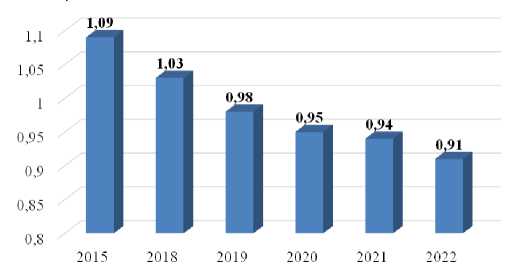 Использование новых технологических приемов позволяет снизить расход кормов на единицу продукции за счет повышения качества кормов. Динамика расхода всех кормов на производство 1 ц молока в центнерах кормовых единиц в 2015–2022 гг. в России наглядно показана на рис. 1.