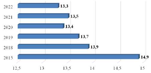 Динамика расхода всех кормов на производство 1 ц привеса крупного рогатого скота в центнерах кормовых единиц в 2015–2022 гг. в России наглядно показана на рис. 2. Происходит снижение данного показателя на 1,6 ц кормовых единиц.