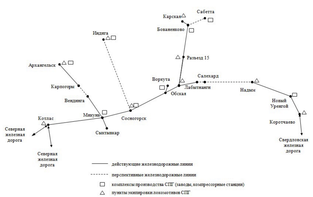 Figure 2. Sketch-map of gas transport infrastructure facilities location for railway transport in the European and sub-Ural Arctic (performed at the Laboratory of Transport Problems).