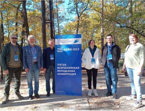 Коллектив лаборатории экспериментальной физики на III Всероссийской молодежной научной конференции «Высокоточная диагностика функциональных материалов: лабораторные и синхротронные исследования», слева направо: Р. Н. Скандаков, д.ф.-м.н., проф. В. Н. Сивков, к.ф.-м.н. С. В. Некипелов, К. А. Бакина, В. О. Рутковский, к.ф.-м.н. О. В. Петрова.