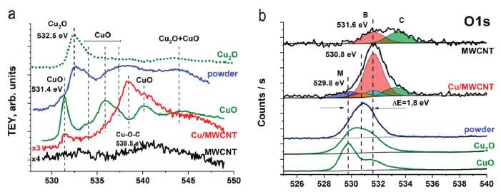 Проведено комплексное исследование композита на основе многослойных углеродных нанотрубок (далее - МУНТ), декорированных наночастицами CuO / Cu2O / Cu, осажденными пиролизом формиата меди, с использованием комплекса комплиментарных методов (сканирующая и просвечивающая электронная микроскопия, рентгеновская дифрактометрия, комбинационное рассеяние света и ультрамягкая рентгеновская спектроскопия). Результаты исследования показывают хорошую адгезию между покрытием из наночастиц меди и поверхностью MWCNT за счет образования кислородного мостика между углеродом внешнего графенового слоя MWCNT и кислородом оксидов CuO и Cu2O. Образование связи Cu – O – C между слоем покрытия и внешней поверхностью нанотрубки четко определяется появлением характерных пиков в спектрах NEXAFS O1s (538,5 эВ) и XPS O1s (531,8 эВ) нанокомпозита Cu/MWCNTs (рис. 2).