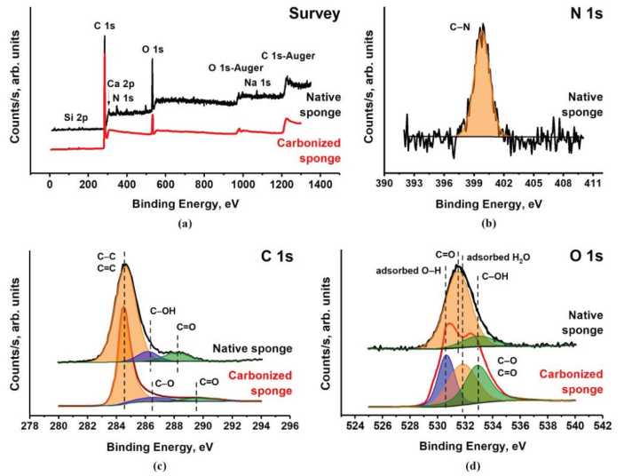 Рисунок 3. XPS-спектры исходной и карбонизированной губок: обзорный спектр (a), N1s (b), C 1s (c) и O 1s (d) спектры.