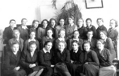 Female staff at the Base of the USSR Academy of Sciences in the Komi ASSR, March 8, 1948 (photo from the Scientific Archive of the Federal Research Centre, Komi Science Centre of the Ural Branch RAS). Third row: second from the right – E. V. Mikheeva, Head of the Scientific Library from 1944 to 1960.