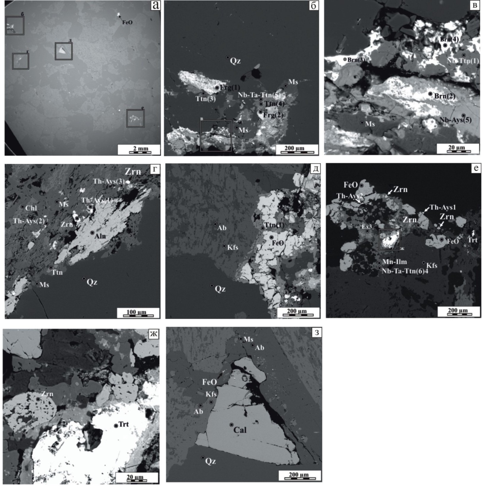 Рисунок 2. Формы выделения редкометалльных, редкоземельных и радиоактивных минералов в редкометалльных аляскитах (обр. 729-1): а – общий вид породы, ненарушенная магматическая микроструктура, рассеянное распределение рудных акцессорных минералов; б – сросток (агрегат) титанита (Nb-Ta содержащего титанита) и фергусонита с мусковитом (в – увеличенный фрагмент); г – алланит, эшинит (и эшинит (Th)), циркон в сростках с мусковитом и хлоритом; д – сросток Nb-Ta содержащего титанита и оксидов железа; е – сросток циркона, торита, эшинита (Th), Nb-Ta содержащего титанита, Mn-ильменитом и иксидами железа (ж – увеличенный фрагмент, «ажурный», «сетчатый», «пористый» циркон); з – аллотриаморфозернистый кальцит в граните.